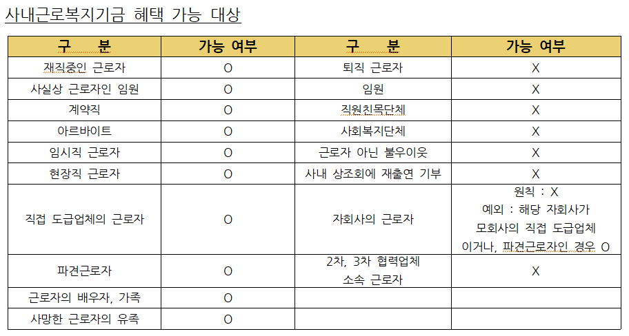 *조건부 가능 : (정관규정이 있는 경우) 근로자의 배우자, 가족, 사망 근로자 유족